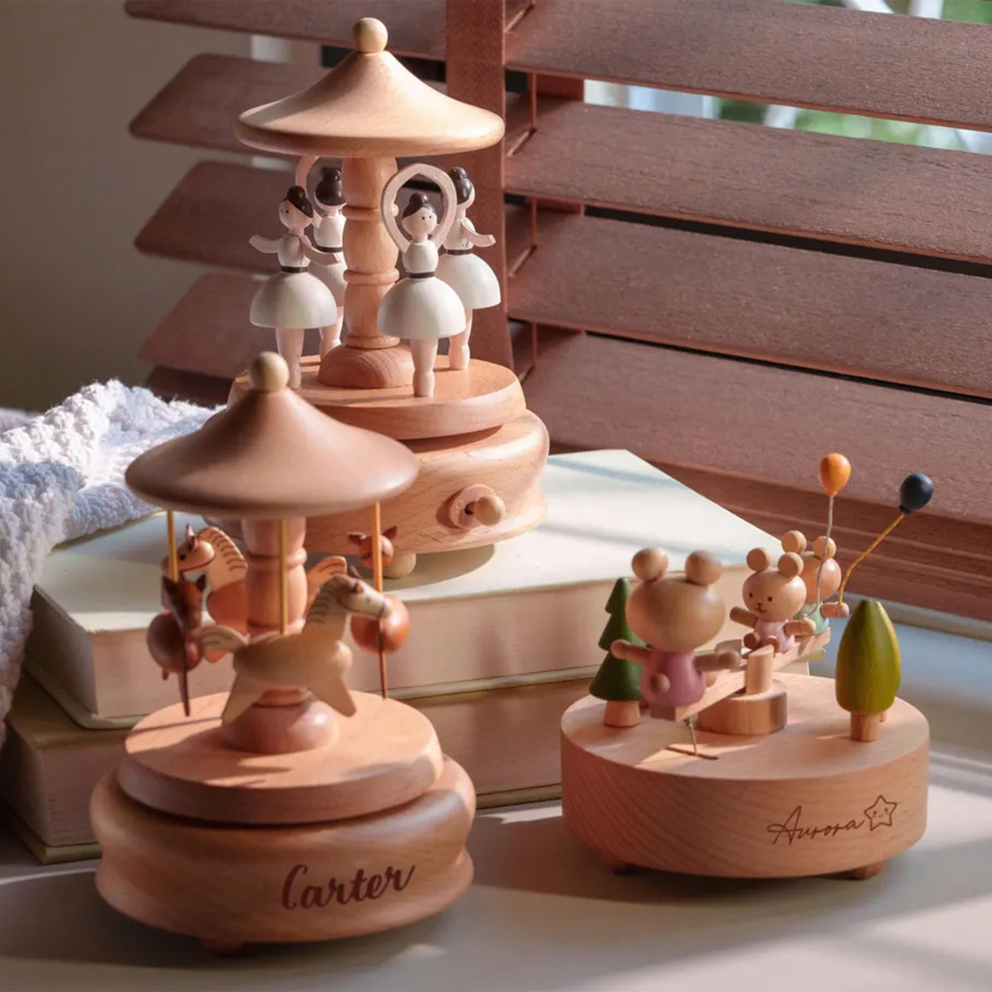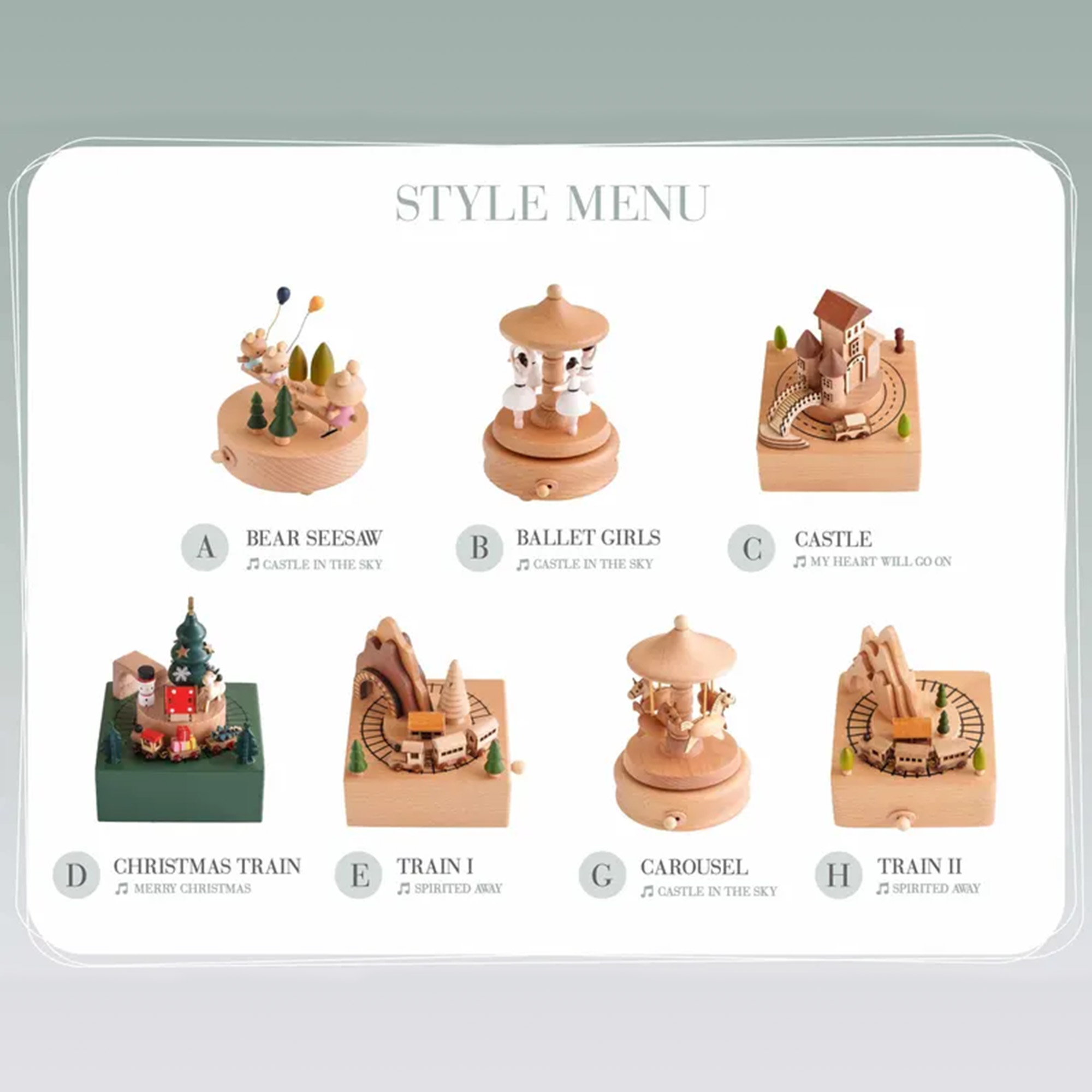 Handcrafted Wooden Music Box – A charming vintage-style musical keepsake made from natural wood, featuring delicate hand-painted details and classic designs like carousels, castles, and ballerinas. The soft tones and gentle motion create a soothing atmosphere for any space.